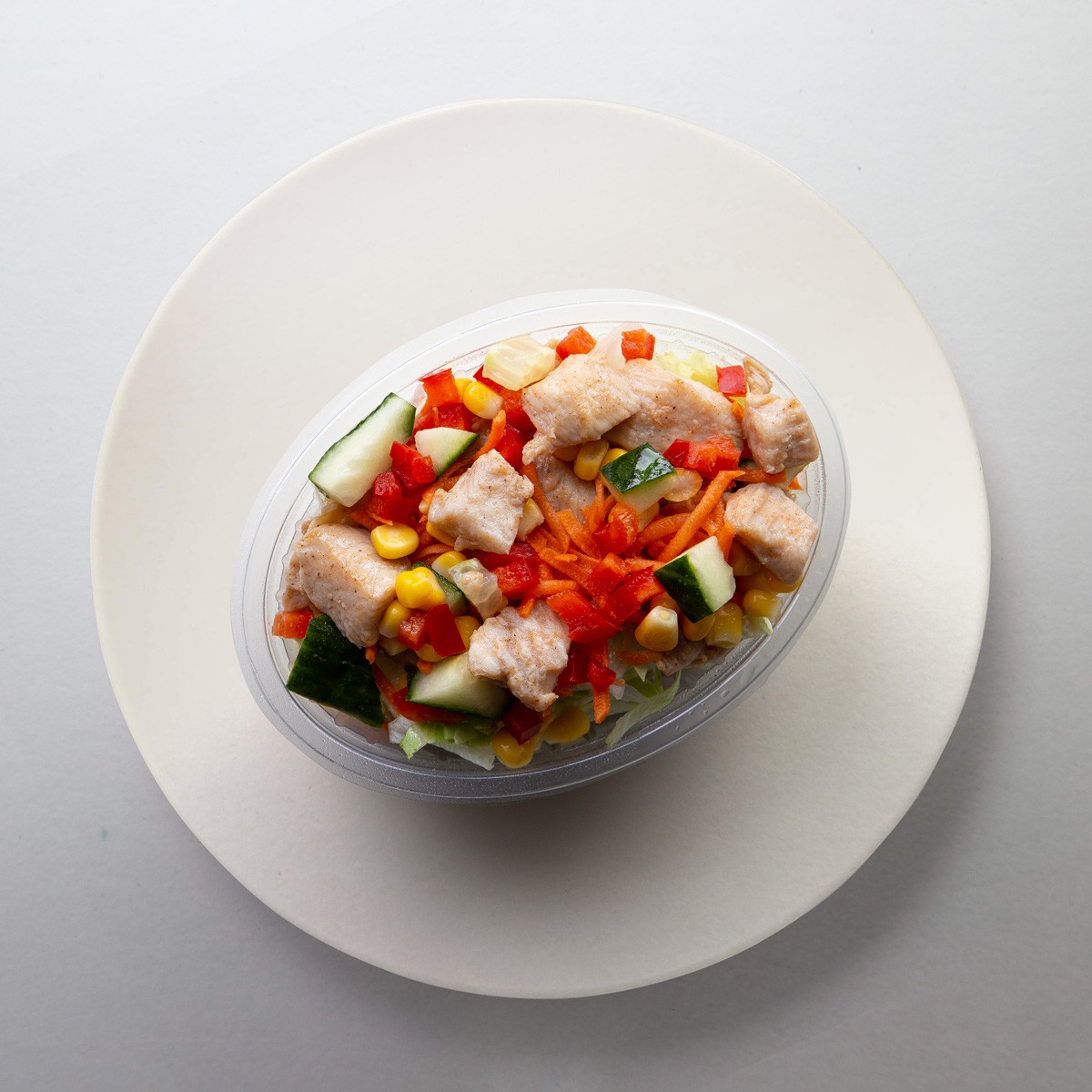 Fulkornspasta, icebergsalat, høsnarungi, gularót, agurk, piparfrukt, mais